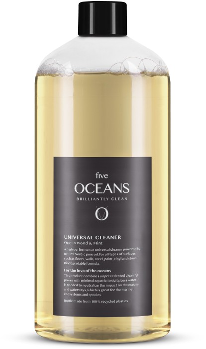 Universal-rengöringen från Five Oceans är framtagen för att ha bättre effekt än vanlig såpa. Kan användas för rengöring av flera ytor i hemmet, t ex golv, stål och vinyl. Rengöringen har en biologiskt nedbrytbar formulering med sockertensider blandad med nordisk tallolja.