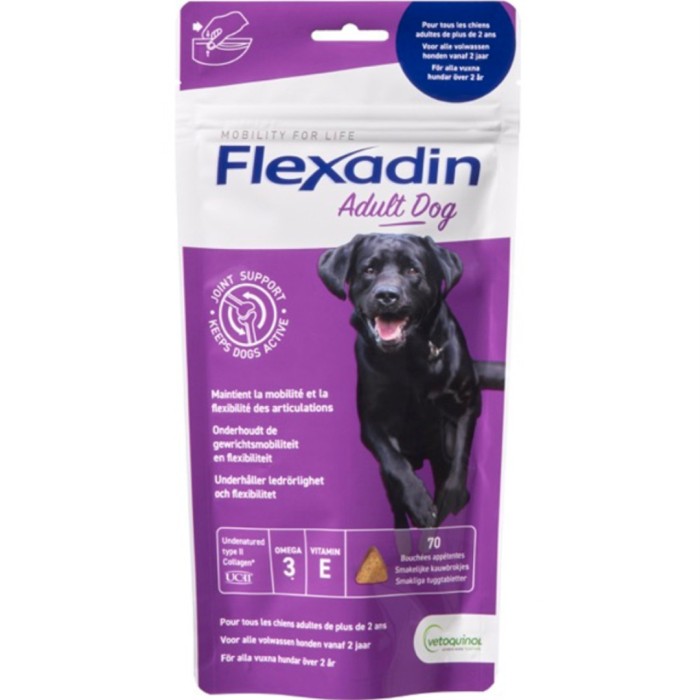 Flexadin Adult Dog har utvecklats för att möta de specifika behoven hos vuxna och seniora hundar över 2 år. Flexadin Adult Dog innehåller den unika kombinationen av UC-II®, omega-3 och vitamin E för att stödja lederna hos hundar. De noga utvalda högkvalitativa, naturliga ingredienserna stödjer lederna och kan hålla hunden smidig.