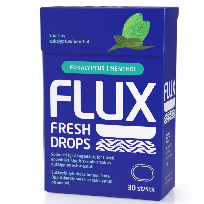 Flux Fresh Drops är fyllda tabletter som ger omedelbar effekt mot dålig andedräkt. Tabletterna har en smak av eukalyptus och mentol. Innehåller sötningsmedel.