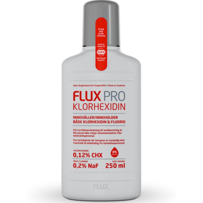 Flux PRO Klorhexidin är en munskölj som innehåller både klorhexidin (0,12%) och fluor (0,2% NaF). Flux PRO Klorhexidin är avsedd för korttidsanvändning när tandborstning är försvårad eller enligt rekommendation från tandvårdspersonal. Kan användas av vuxna och barn över 12 år.