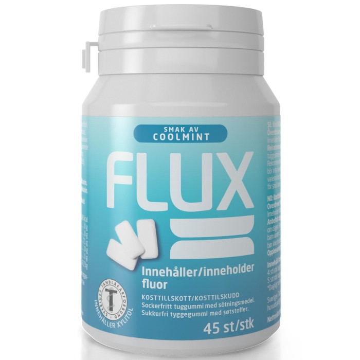 Flux tuggummi kan användas av vuxna och barn från 12 år. Kan tas efter måltid för att skydda tänderna mot syraattacker som angriper emaljen efter att du har ätit och druckit. För att få en gynnsam effekt bör man tugga tuggummit i minst 20 minuter. Innehåller sötningsmedel. Innehåller fluor (0,14 mg F/bit).