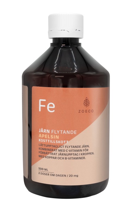 Zoeco Flytande Järn är ett kosttillskott som innehåller lättupptagligt järnglukonat. Järn bidrar till normal bildning av röda blodkroppar och hemoglobin, och bidrar till att minska trötthet och utmattning. Detta järntillskott innehåller även vitamin C, vilket ökar kroppens förmåga att absorbera järnet, samt koppar och B-vitaminer. Kan användas under graviditet och amning, av kvinnor i fertil ålder samt av idrottare. Är även lämpligt för vegetarianer och veganer.