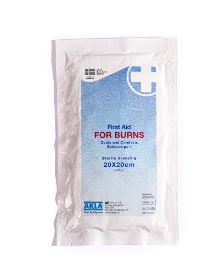 Akla For Burns Brännskadekompress 20x20 cm är ett sterilt brännskadeförband för första hjälpen-användning på alla typer av brännskador. Förbandet upplevs smärtlindrande och minskar risken för blåsbildning. Om kompressen används korrekt kan den förkorta läkningsprocessen.
