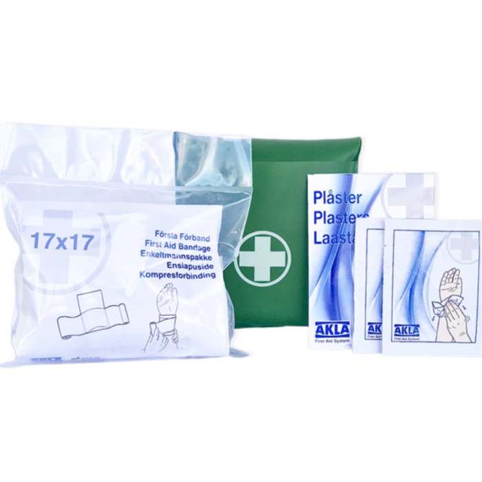 AKLA Första hjälpen "Fickförpackning" är en liten och behändig förpackning för små skador - smidig att bära med sig i väskan eller i en benficka.