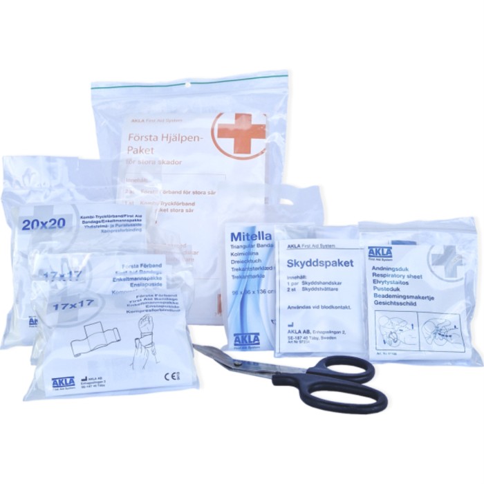 Innehåll - 1 Andningsduk med backventil (art. 97106) - 1 Sax 19cm, rostfri (art. 97465) - 2 Sterilt Första Förband 17x17cm (art. 92111) - 1 Mitella (art. 93125) - 1 Sterilt kombi/tryckförband 20x20cm (art. 92502) - 1 Skyddspaket (art. 97234)