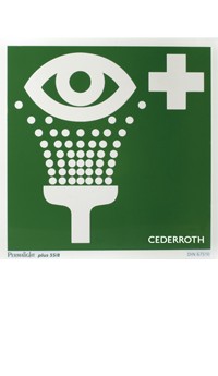 Skylt som hänvisar till Första Hjälpen-station för ögondusch och som lyser i mörker. Skylten är dubbelsidig vilket betyder att du kan fästa den i taket, eller välja att fästa den på en vägg.