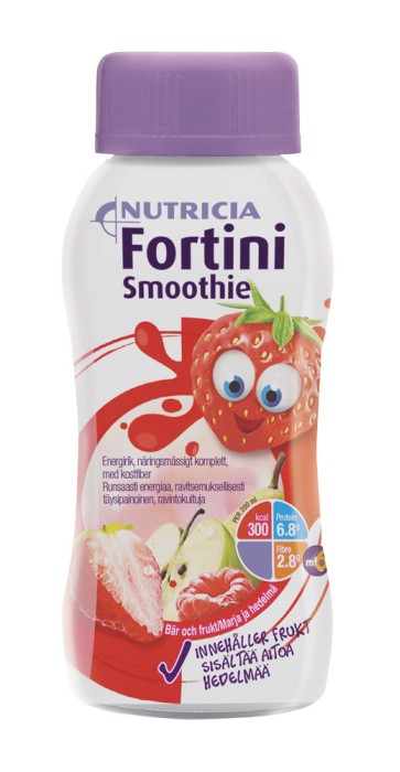 Näringsvärde per 100 ml: Energi kcal 150 / kJ 625 Fett (39 E%) g 6,4 - mättat g 0,8 - enkelomättat g 3,8 - fleromättat g 1,8 - linolsyra g 1,4 - a-linolensyra g 0,3 Förhållandet n-6:n-3 5:1 Kolhydrat (50 E%) g 19,0 - varav sockerarter g 11,6 - därav laktos g <0,025 Kostfiber (2 E%) g 1,4 - lösliga g 1,0 - olösliga g 0,4 Protein (9 E%) g 3,4 Salt g 0,18 Ingredienser: Vatten, fruktpuré och koncentrat (15%), jordgubbspuré (3,6%), hallonpuré (3,6%), äppelpuré (3,5%), päronpuré (3,5%), citronjuice från koncentrat, (0,2%)b, sackaros, maltodextrin, vegetabiliskt fett (raps- och solrosolja), MJÖLKprotein, koncentrerad morotsjuice, (1,5%), glutenfri kostfiberblandning (SOJApolysackarider, inulin, oligofruktos, resistent stärkelse, gummi arabicum, cellulosa), surhetsreglerande medel (citronsyra, fosforsyra), aromämne, kalciumlaktat, stabiliseringsmedel (pektin), emulgeringsmedel (mono- och diglycerider av fettsyror), kaliumcitrat, risstärkelse, dinatriumvätefosfat, magnesiumcitrat, natriumcitrat, kalciumvätefosfat, kolinklorid, Karotenoider (innehåller SOJA) (ß-karoten, lutein, lykopen), natrium-L-askorbat, L-askorbinsyra, taurin, järnpyrofosfat, zinksulfat, L-karnitin, nikotinamid, DL-a-tokoferylacetat, natriumselenit, retinylacetat, D-biotin, kolekalciferol, kalcium-D-pantotenat, tiaminhydroklorid, mangansulfat, kopparsulfat, riboflavin, pyridoxinhydroklorid, pteroylmonoglutaminsyra, kaliumjodid, natriumfluorid, fytomenadion, cyanokobalamin, natriummolybdat, kromklorid.