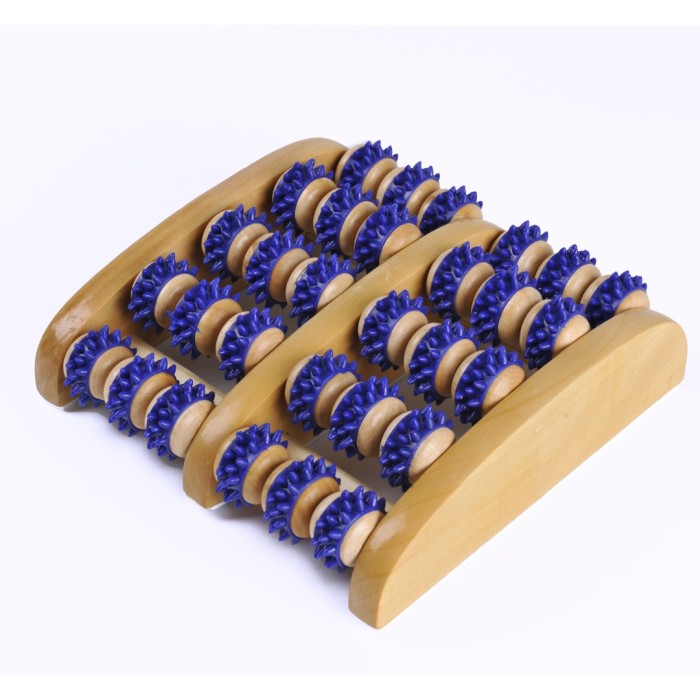 En fotmassage-rullbräda där du kan massera båda fötterna samtidigt genom att föra fötterna fram och tillbaka mot de 30 träkulorna klädda med taggiga plastringar. Fotmassagen står stadigt på golvet med hjälp av gummerade band på undersidan.