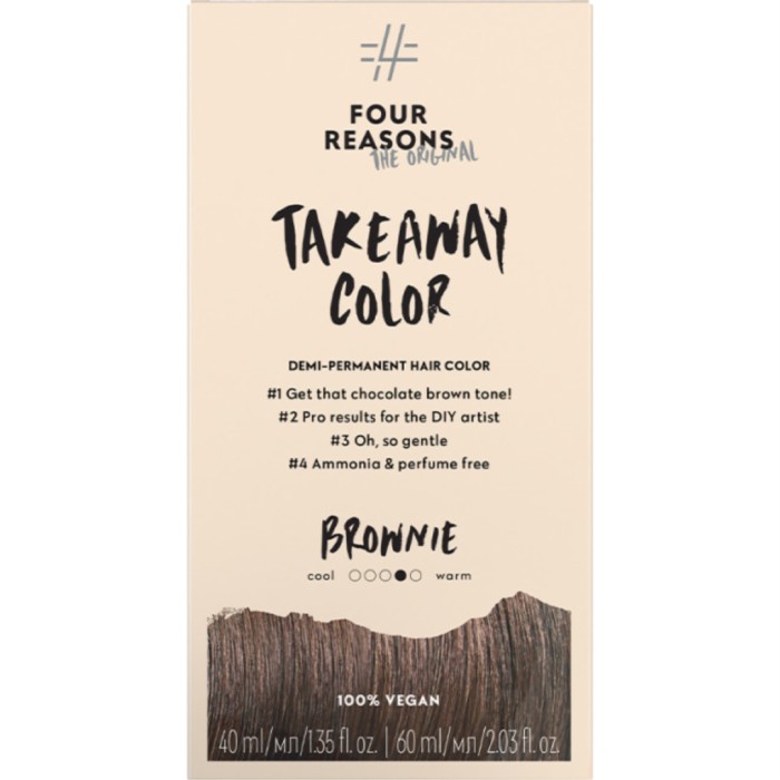 Take Away Color från Four Reasons är en ammoniakfri och oparfymerad intensivtoning för hemmabruk som ger håret färg, glans och lyster. Täcker grått hår upp till 70% och ger ett naturligt resultat på ett skonsamt sätt.