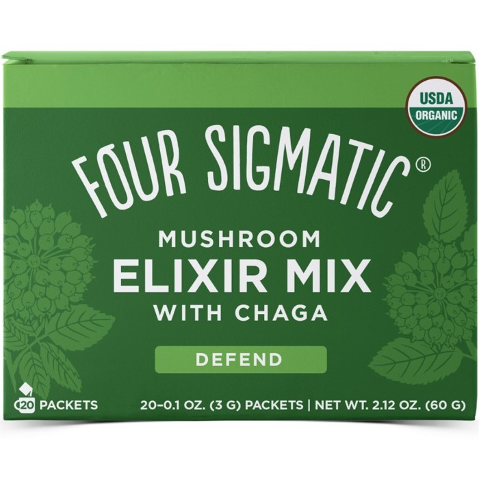 Four Sigmatic Mushroom Elixir Mix Chaga är ett pulver i dospåsar med chaga (sprängticka). Chaga växer ofta på björkar och Four Sigmatis Elixir innehåller en blandning av vildväxande chaga, sibirisk ginseng, mynta och nypon. Pulvret blandas ut med hett vatten till en dryck.