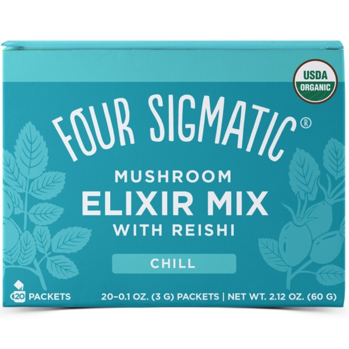 Four Sigmatic Mushroom Elixir Mix Reishi är ett pulver till en dryck. Pulvret innehåller svampen reishi och en portion av Four Sigmatics Elixir innehåller 1,500 mg torkad reishisvamp. Pulvret blandas ut i hett vatten och har en något bitter smak.