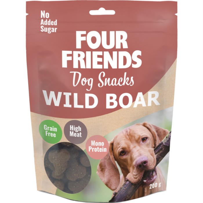 FourFriends Dog Snacks är baserat på enbart en typ av protein vilket kan passa hundar med foderintolerans eller känslig mage. Tillsatt C-vitamin som kan stärka immunförsvaret. Rosmarinextrakt som kan stötta matsmältningen. Godiset innehåller omegafettsyror som bidrar till frisk hud och päls. Med tranbär och linfrö samt utan tillsatt socker. Denna Dog Snack är baserad på torkat vildsvinskött.