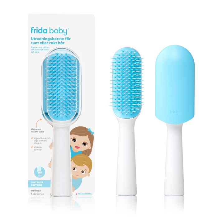 Frida Baby Utredningsborste för rakt eller fint hår är designad för att få styr på barnets tovor, utan att orsaka tårar. Hårborsten har mjuka och flexibla borst som ger en skonsam borstning. Den fungerar på både vått och torrt hår. Borsten har också en platt ände vilket gör att den kan stå av sig själv.