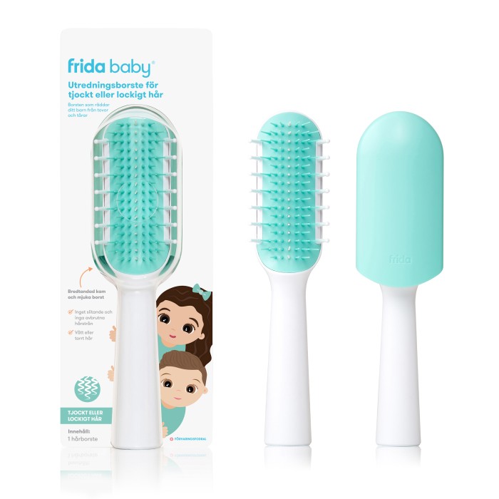 Frida Baby Utredningsborste för tjockt eller lockigt hår är designad för att få styr på barnets tovor, utan att orsaka tårar. Hårborsten har mjuka och flexibla borst som ger en skonsam borstning. Den fungerar på både vått och torrt hår. Borsten har också en platt ände vilket gör att den kan stå av sig själv.
