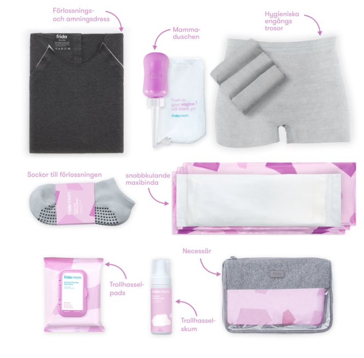 Frida Mom Mammas BB-Kit innehåller produkter som underlättar och ger lindring under och framförallt efter förlossningen. Kitet innehåller bland annat hygieniska engångstrosor, snabbkylande maxibindor för att lindra värk och svullnad efter förlossningen och olika trollhasselprodukter som ger en svalkande känsla för underlivet.