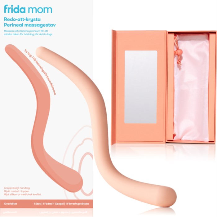 Frida Mom Redo-att-krysta är en perinial massagestav, en silikonklädd stav som används för att massera och stretcha perineum för att minska risken för bristning när det är dags för förlossning.