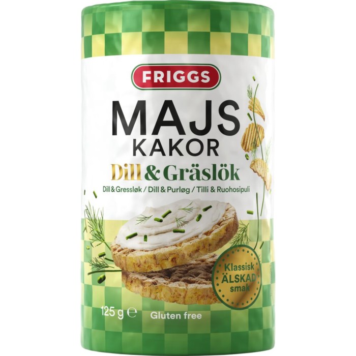 Friggs Majskakor med dill & gräslök är en god smakkombination - passar kanske perfekt när du är sugen på en liten knaprig snack. Glutenfria.