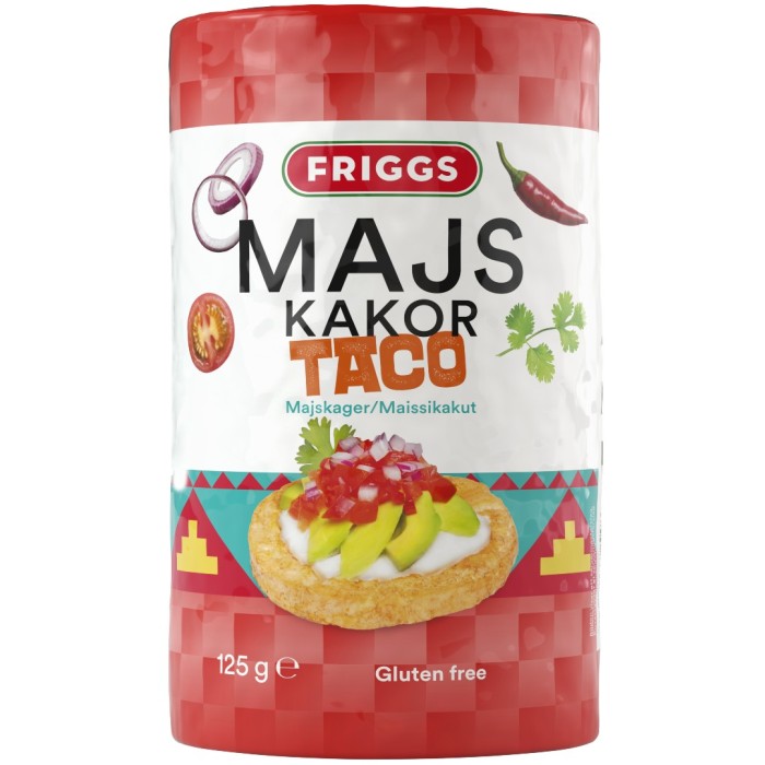 Friggs Majskakor Taco är majskakor med en smak av fredagsfavoriten: taco. Majskakorna passar bra som snack eller ett litet mellanmål.