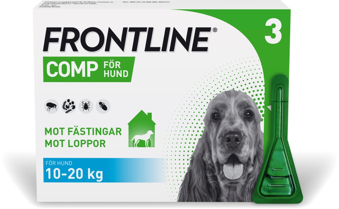 Frontline Comp Spot-on, lösning används mot loppor och fästingar och/eller pälsätande löss på hund. Frontline Comp 134 mg/120,6 mg är anpassad för hundar som väger 10 kg - 20 kg.