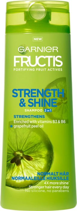 Fructis Strength & Shine Shampoo 2-in-1 är ett schampo som ger glans till normalt hår. Strength & Shine 2-in-1 innehåller olja från grapefruktskal och vitaminerna B3 och B6 för att vårda håret och stärka hårfibrerna. Schampot har en balsameffekt för att göra håret mjukt och lättare att reda ut.