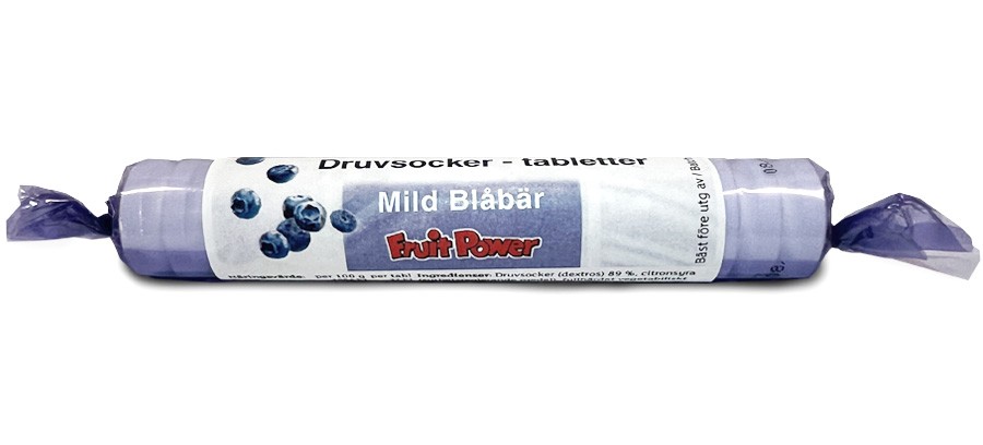 Fruit Power druvsockertabletter med en mild smak av blåbär. Tabletterna smälter snabbt i munnen och ger snabb energi vid behov.