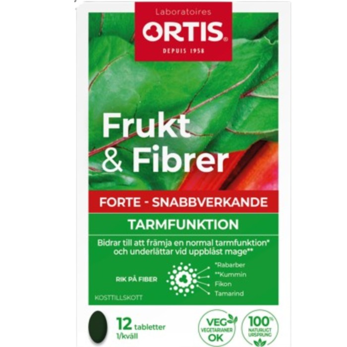 Frukt & Fibrer är ett kosttillskott med extrakt av rabarber, tamarind och fikon. Forte innehåller även kummin.