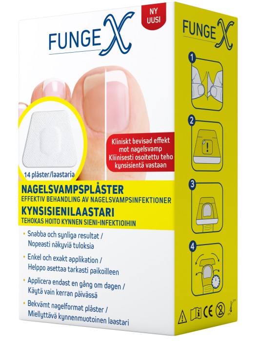 FungeX Nagelsvampsplåster är en medicinteknisk produkt för behandling av nagelsvamp och missfärgade naglar. FungeX Plåster sätts på den drabbade nageln och släpper ifrån sig aktiva ingredienser i de max 8 timmar man ska låta plåstret sitta på (gärna över natten). Plåstret är "nagelformat" för att vara enkelt att applicera och har en fuktgivande effekt.