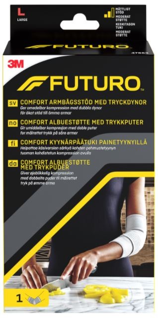 Futuro Comfort Armbågsstöd ger ett stabilt stöd till stela, svaga eller skadade armbågar och underarmar. Med dubbla dynor som ger kompression för ett ökat stöd till ömma armar. Armbågsstödet är tillverkat i ett stretchbart material och är konturformat för bästa passform. Passar både höger och vänster arm och kan användas vid vardagsaktiviteter.