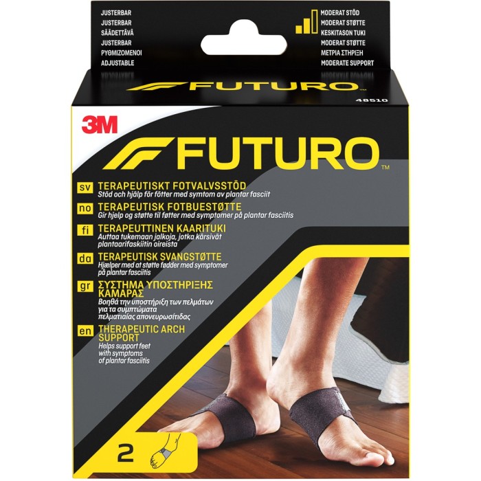 Futuro Terapeutiskt Fotvalvsstöd ger stöd till fötter med symtom av plantar fasciit. Kan användas som stöd under dagen, när du tränar eller under vardagsaktiviteter för att ge kompression, stöd och dämpning. Fotvalvsstödet har två flyttbara hålfotsinlägg för att ge ett anpassat stöd. Tillverkat i ett stretchigt och ventilerande material för att ge en behaglig kompression. Kan användas med eller utan strumpor och/eller skor.