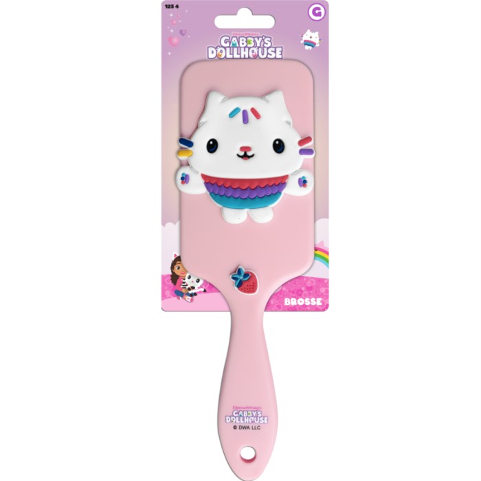 Gabbys Dollhouse Kuddborste Cakey är en utredande kuddborste för barn, som passar för alla hårtyper. Hårborsten har en soft-touch-yta, är rosa i färgen och har figuren Cakey i 3D.