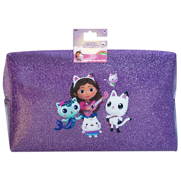 Gabbys Dollhouse Necessär är en lila glittrig necessär med figurerna från Gabby´s Dollhouse. Mått: H19, B25, D5 cm.