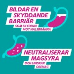 2. genom att bilda ett skyddande lager ovanpå maginnehållet vilket lindrar brännande känsla i i upp till 4 timmar.
