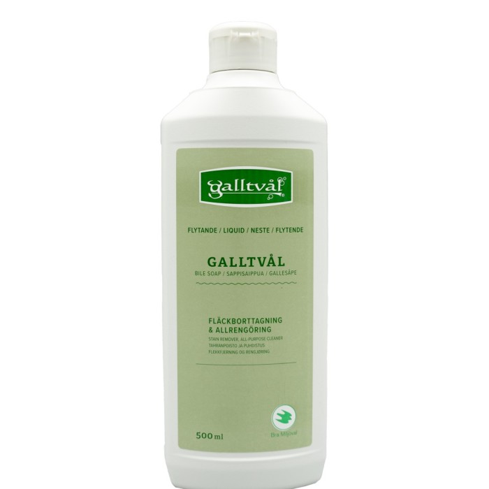 Galltvåls flytande rengörings- och fläckborttagningstvål är en helt naturlig tvål som passar för all sorts rengöring. Galltvålen innehåller bland annat oxgalla och klorofyll som är effektiva mot olja, fett, fläckar från gräs, bär, frukt och grönsaker. Oxgalla är ett beprövat, naturligt ämne för att få bort fettfläckar från plagg.