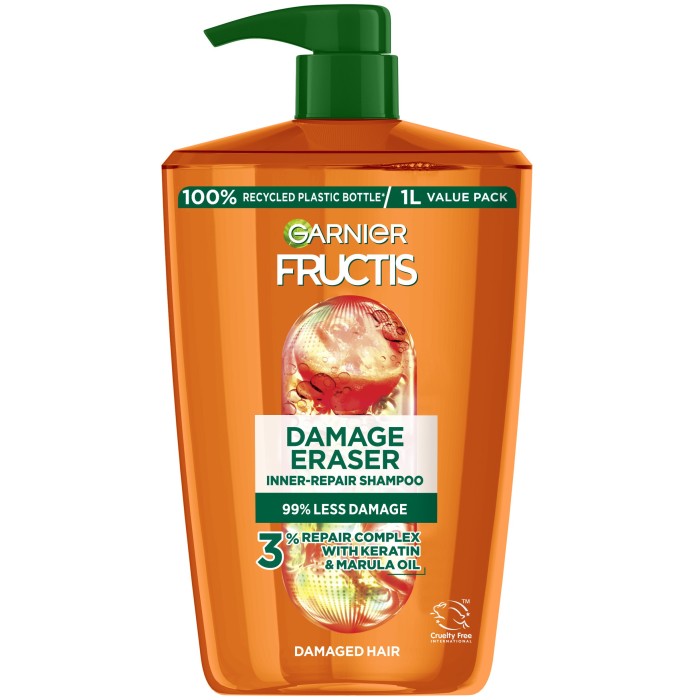 Garnier Fructis Damage Eraser Shampoo är ett schampo för skadat hår. 99 % färre skador*, 10 x mer motstånd**, 7 x mindre grovt hår***. Formuleringen är berikad med aktiva ingredienser som tränger in i upp till 10 lager av hårstrået för att fylla ut fibrerna och reparera ända in i hårstråets inre. Hårytan förseglas för att bevara keratinet. Berikad med 3 % Repair Complex med keratin och marulaolja. Vegansk formulering (utan ingredienser av animaliskt ursprung). Stor flaska med 1000 ml. Använd gärna hela rutinen med schampo + balsam + inpackning + leave-in.