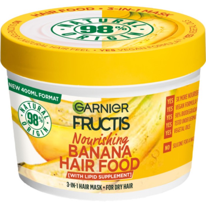 Garnier Fructis Hair Food Banana Mask är en hårkur för torrt hår. Hair Food Banana ger intensiv näring till håret, gör håret lent och lättare att reda ut. Hårkuren kan användas på tre sätt: som balsam, hårkur eller leave-in. Utan silikon för en naturlig känsla. Vegansk formulering och 97 % innehåll av naturligt ursprung.