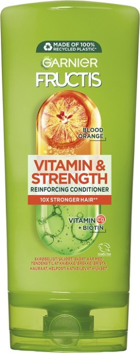 Fructis Vitamin & Strength hårbalsam är berikat med ingredienserna blodapelsin, som hjälper till med att stärka hårfibret, och ett multivitaminkomplex av C-vitaminderivat och biotin, som hjälper till att stärka håret. Veganska formulering.