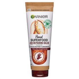 Garnier Hand Superfood Cocoa Repairing Balm är en handkräm med kakaosmör och ceramid för mycket torra och nariga händer. 98 % av innehållet har naturligt ursprung. Hand Superfood Cocoa återfuktar huden i upp till 48 timmar*. (*Instrumentellt test, 24 personer.)