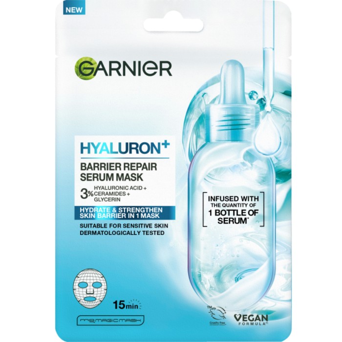 Hyaluron+ Barrier Repair Serum Mask från Garnier är en arkmask för känslig hud. Garnier Hyaluron+ Barrier Repair Tissuemask har en formulering berikad med hyaluronsyra och ceramider för att hjälpa till att återfukta torr hud. Masken är berikad med mängden som motsvarar en flaska serum* och hjälper till att stärka hudbarriären**. Masken gör att huden känns mer återfuktad, slätare och mer smidig redan efter en användning***.