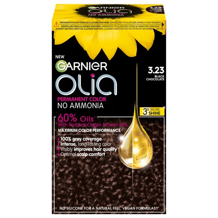 Garnier Olia 3.23 Black Chocolate är en permanent hårfärg som är baserad på olja. Olia innehåller inte någon ammoniak. Ger en maximal färgprestation och en synlig förbättring av hårkvaliteten.