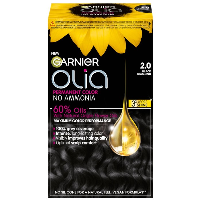 Olia 2.0 Black Diamond från Garnier är en permanent hårfärg som är baserad på olja. Olia innehåller inte någon ammoniak och ger en maximal färgprestation och en synlig förbättring av hårkvaliteten. Garnier Olia ger upp till 100 % gråhårstäckning och ger optimal komfort för din hårbotten.