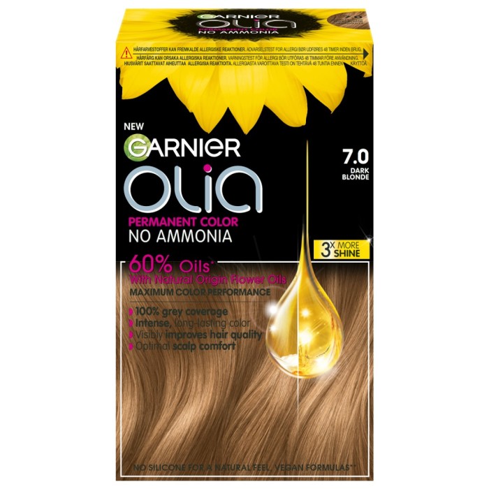 Garnier Olia 7.0 Dark Blond är en permanent hårfärg som är baserad på olja. Olia innehåller inte någon ammoniak och ger en maximal färgprestation och en synlig förbättring av hårkvaliteten.