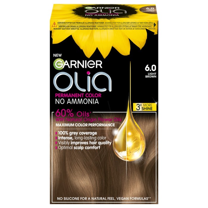 Olia 6.0 Light Brown från Garnier är en permanent hårfärg som är baserad på olja. Olia innehåller inte någon ammoniak och ger en maximal färgprestation och en synlig förbättring av hårkvaliteten.