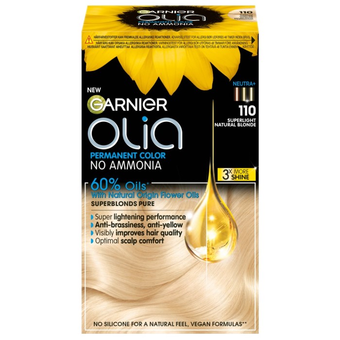 Olia 110 Super Blonds från Garnier är en permanent hårfärg som är baserad på olja. Olia innehåller inte någon ammoniak och ger en maximal färgprestation och en synlig förbättring av hårkvaliteten.