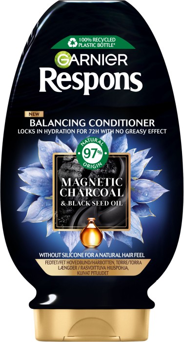 Garnier Respons Magnetic Charcoal & Black Seed Oil Balancing Conditioner är ett hårbalsam utvecklat för att skapa balans i hår med tendens till fet hårbotten och torra längder.