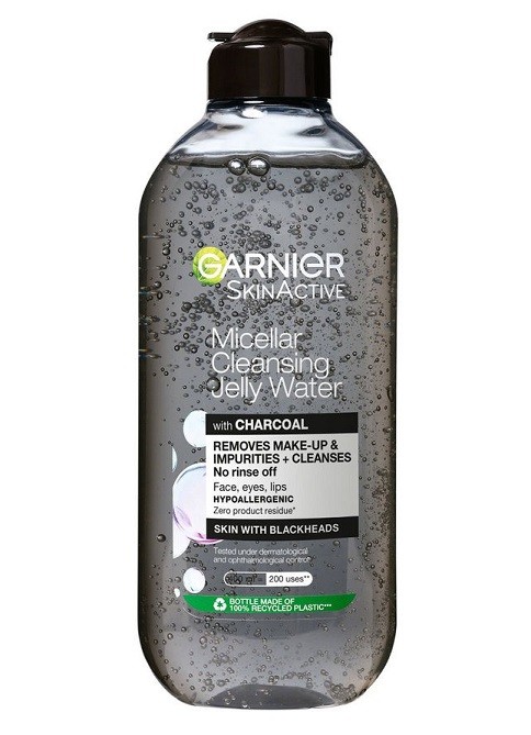 SkinActive Micellar Cleansing Jelly Water with Charcoal från Garnier är en rengöring som tar bort makeup och rengör huden. Detta är något av en allt-i-ett-produkt som tar bort makeup och orenheter, och rengöringen ska inte sköljas av. Kan användas till ansikte, ögon och läppar.