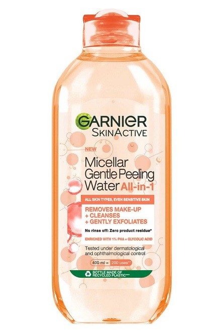 Garnier SkinActive Gentle Micellar Peeling Water All-in-1 tar bort makeup och rengör som ett vanligt micellärvatten, samtidigt som den varsamt exfolierar huden.