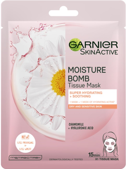 Ge din hud lite extra omtanke med en ansiktsmask! Garnier Skin Active Moisture Bomb Tissue Mask Super Hydrating + Soothing Mask är en ansiktsmask för torr och känslig hud. Masken verkar återfuktande och lugnande för huden. Låt den verka i 15 minuter och den ger en intensiv återfuktning till huden.