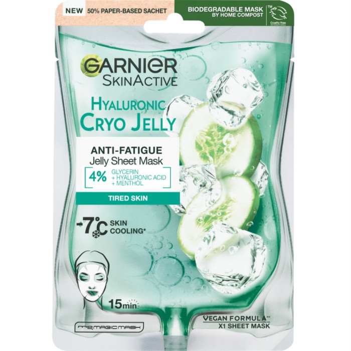 Hyaluronic Cryo Jelly Sheet Mask från Garnier SkinActive är en ansiktsmask som verkar avkylande och reducerar trötthetstecken i huden. Kanske en skön mask att prova om din hud känns matt och glåmig. Hyaluronic Cryo Jelly Sheet Mask har en gelkonsistens och är berikad med hyaluronsyra och gurka. Kyler ner huden för att snabbt minimera trötthetstecken. Berikad med 4 % glycerin, mentol och hyaluronsyra, stärker hudens barriärfunktion och ger en uppfriskande boost. Passar alla hudtyper. Vegansk formulering (utan ingredienser av animaliskt ursprung).