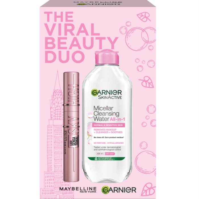 The Viral Beauty Duo Gift Box från Garnier innehåller populära Maybelline Lash Sensational Sky High Mascara Black + Garnier Micellar Cleansing Water for Sensitive Skin 400 ml.