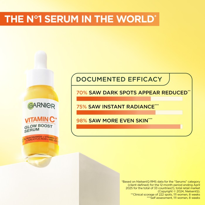 Garnier Skin Active Vitamin C Glow Boost är ett ansiktsserum som innehåller [3,5 %] C-vitamin*, niacinamid och salicylsyra som tillsammans synligt minskar mörka fläckar och ge huden lyster. Serumet är framtaget för att reducera synligheten av mörka hudfläckar och förbättra hudens lyster.